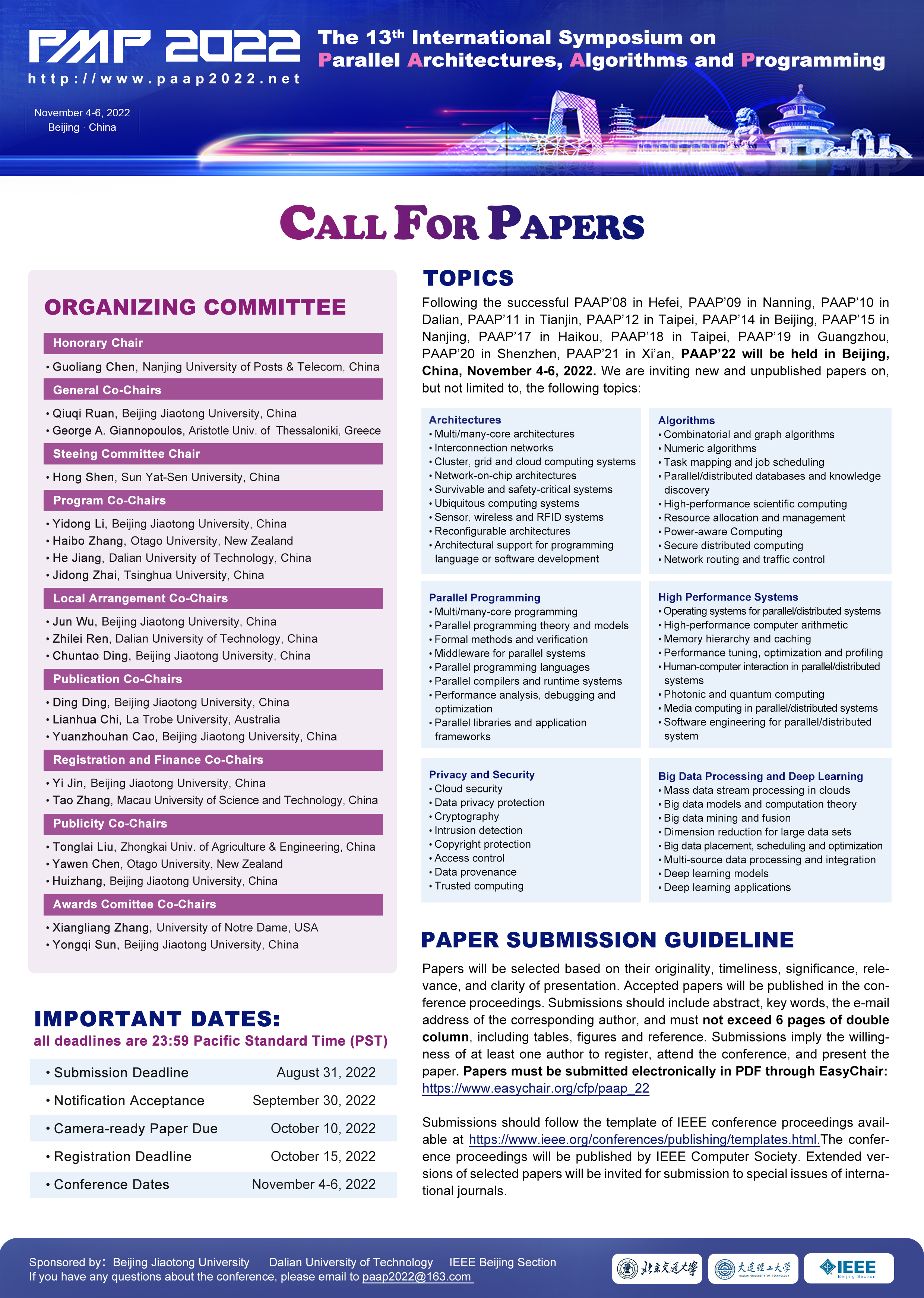 2022年第13届并行结构、算法与程序设计国际会议将在williamhill英国官网举办