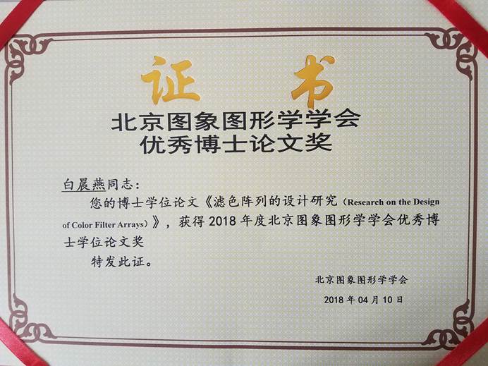 其中,公司于剑教授和林宙辰教授(北京大学)联合指导的博士研究生白晨燕,赵瑞珍教授、岑翼刚教授联合指导的博士研究生王恒友,二人的博士学位论文《滤色阵列的设计研究》和《面向图像恢复的低秩矩阵重构算法研究》分别荣获北京图象图形学学会2018优秀博士学位论文奖。