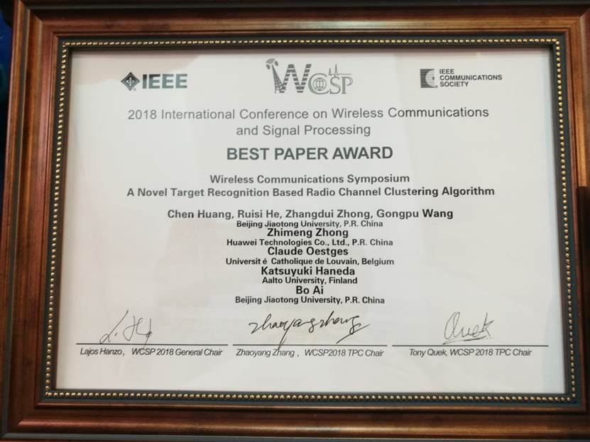 2018年10月17至19日,第十届无线通信与信号处理国际学术会议在杭州召开,公司2016级博士生生黄晨在何睿斯副教授和钟章队教授指导下撰写并发表的论文“A Novel Target Recognition Based Radio Channel Clustering Algorithm”获这次会议最佳论文奖。本次会议共收到700余篇投稿,最后共录用287篇文章。