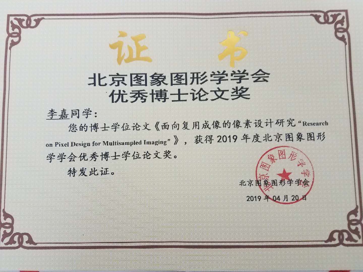 公司李嘉博士荣获北京图象图形学学会 2019优秀博士学位论文奖