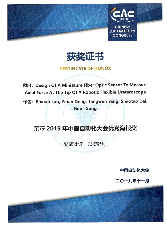 中国自动化大会是由中国自动化学会主办的国内最高层次的大型综合性学术会议。今年大会共录用了1200余篇学术论文,并进行了海报展示。经过专家的严格评审,选出本届大会的“优秀海报”总共34篇(http://www.cac2019.org/show.php?id=102)。其中,公司研究生罗碧璇同学的论文“Design of a Miniature Fiber Optic Sensor to Measure Axial Force at the Tip of a Robotic Flexible Ureteroscope”获奖。
