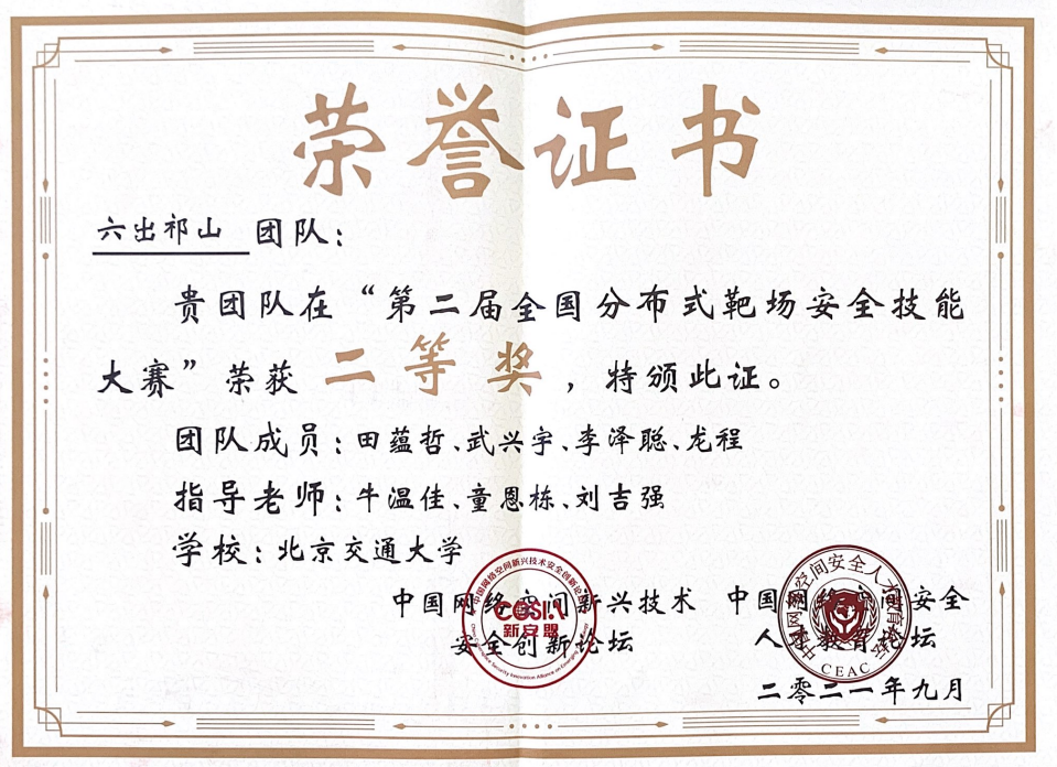 由鹏城国家实验室(副部级)、华中科技大学、武汉大学、四川大学、中电长城网际、中汽创智、宁波工业互联网研究院联合承办,方滨兴院士等专家参与指导的第二届基于全国分布式靶场的安全技能大赛于9月17日圆满落幕。williamhill英国官网网络空间安全学科责任教授刘吉强老师领队、牛温佳和童恩栋老师指导的“六出祁山”队经过8小时的鏖战再获佳绩,以3665分夺得第二届分布式靶场安全技能大赛第二名,获得二等奖。