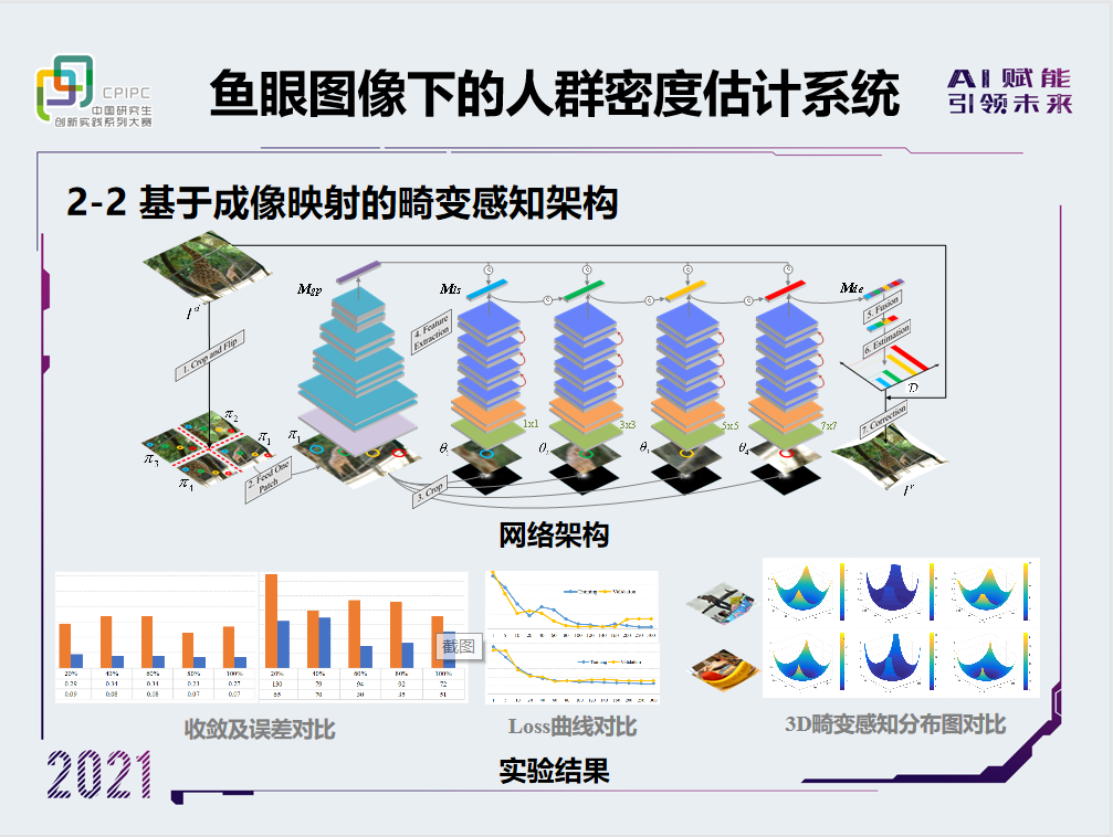 作品介绍:本项目围绕大视场下人群密度估计问题,设计了基于鱼眼图像的人群密度估计系统。相较之前的研究工作,本项目最先提出利用可以拍摄超广区域的鱼眼镜头作为图像拍摄设备,并且首次针对大视场的鱼眼人群图像采集建立并标注数据集。除此之外,本项目创新性地提出了鱼眼畸变感知、鱼眼密度分布匹配和人群密度估计网络等深度学习网络,从而实现对鱼眼图像中的人群数量进行估计。