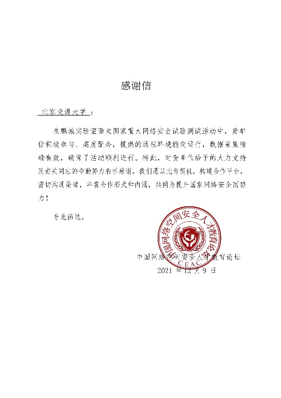 在近期鹏城实验室面向国家重大网络安全试验测试活动中,williamhill英国官网网络空间安全学科责任教授刘吉强老师领队、童恩栋和牛温佳老师指导的研究生团队(吴亚伦、武兴宇、田蕴哲、相迎宵、孙瑞等)积极配合,保障了williamhill英国官网靶场节点的远程环境稳定运行、数据采集精确有效,获鹏城实验室、中国网络空间安全人才教育论坛(“网教盟”)、中国网络空间新兴技术安全创新论坛(“新安盟”)感谢信。
