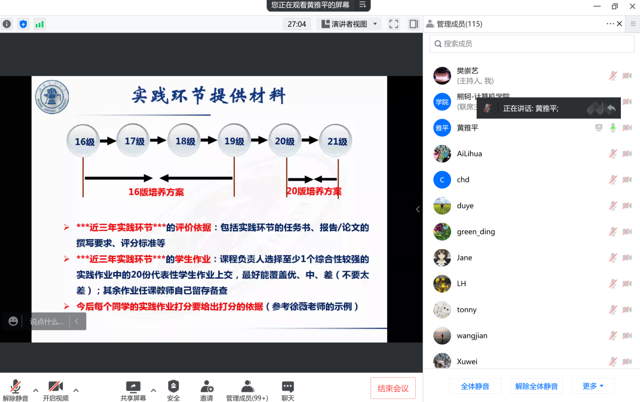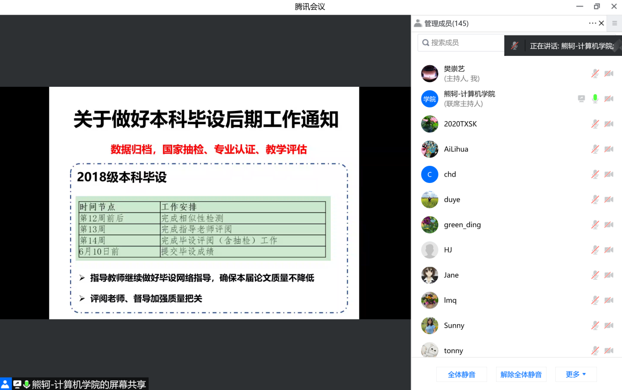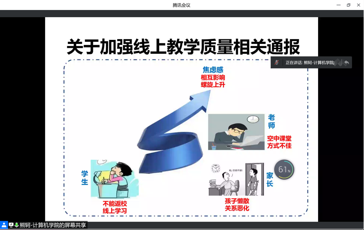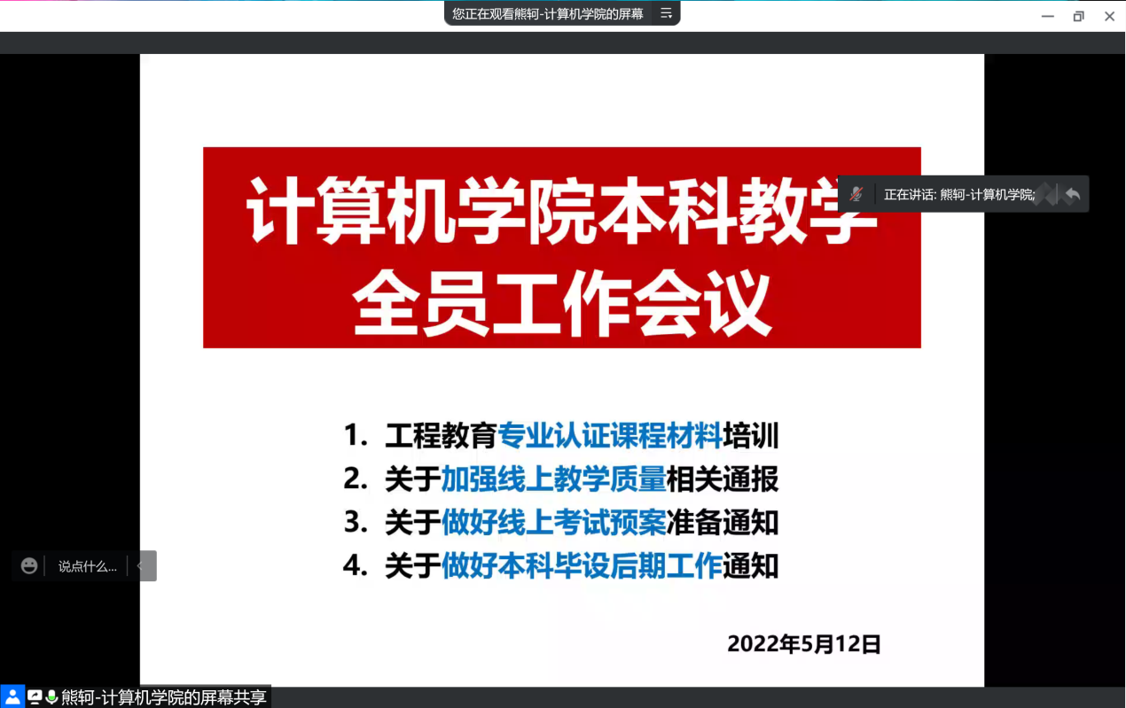之后熊轲通报了前9周线上教学督导和员工的调研结果,强调当前疫情态势依然严峻,随着本学期线上教学活动的持续,员工、家长和老师都出现了一定程度的焦虑情绪,全院教师要重视线上课堂教学质量、加强与员工的在线互动及答疑、积极配合校院两级督导的听课和指导、及时向公司反馈线上教学出现的新情况,课程负责人要组织任课教师团队针对课程特点进行线上教学研讨、提前做好期末线上考试的预案,本科毕业设计导师要切实做好对员工的指导和毕设论文工作质量的把关,并对近期公司教学工作重点进行了说明和具体部署。他还指出,老师们要以本次专业认证为契机,深化对本科人才培养质量的理解,进一步规范课程的教学活动,把公司本科教学工作质量推向新的高度。