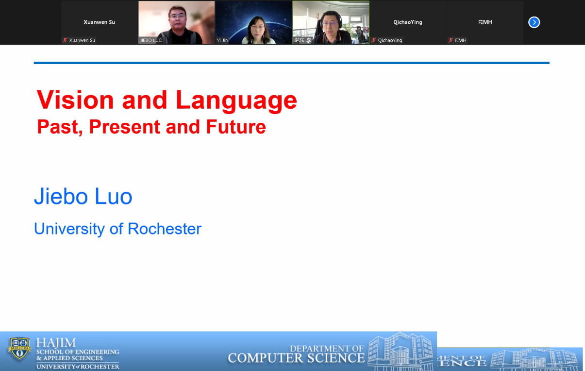 本次活动邀请到了来自美国罗切斯特大学的罗杰波教授,罗教授是IEEE会士、ACM会士、SPIE会士、AAAI会士以及IAPR会士,现任IEEE TMM期刊总编,罗教授的主要研究兴趣领域包括计算机视觉、NLP、机器学习、数据挖掘、计算社会科学和数字健康。罗教授和大家探讨的主题是“计算机视觉和语言:过去,现在和未来”。活动由计算机与信息技术公司金一教授主持,计算机与信息技术公司副经理李浥东教授开幕致辞,200多名师生在线参与了本次活动。