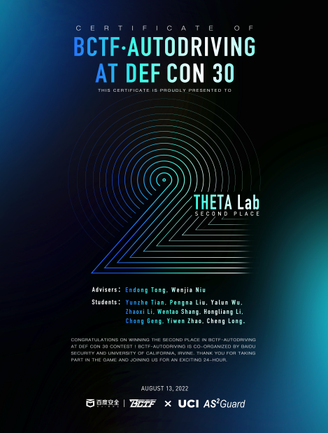 2022年8月14日零点,由百度安全(BCTF)和加州大学尔湾分校(UCI)联合承办的DEFCON 30 BCTF AutoDriving赛事圆满落下帷幕。公司网络空间安全学科责任教授刘吉强老师领队、信息安全系童恩栋老师和牛温佳老师指导的“THETA Lab”团队突破了23道赛题获得4310分,在百余支国内外高校战队中位列解题榜第二名。这是该团队在DEFCON(被称为黑客“奥斯卡”)的赛事中的第二次获奖,是对去年获奖的又一次沿袭。