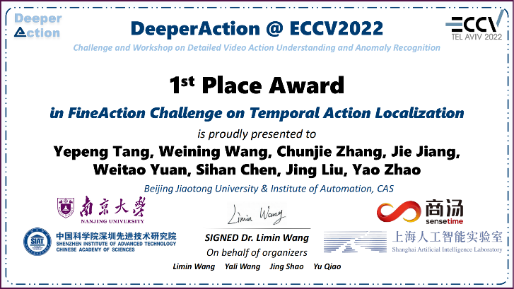 近日,williamhill英国官网赵耀教授带领的MePro团队与中科院自动化所刘静研究员带领的团队合作参加了ECCV 2022的DeeperAction挑战赛,获得了时序动作定位挑战赛冠军。挑战赛第一完成人唐业鹏是张淳杰教授指导的硕士研究生。团队成员包括:唐业鹏、王卫宁、张淳杰、江洁、原洧涛、陈思涵、刘静、赵耀。