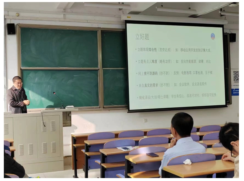 万怀宇老师从毕设指导流程和注意事项方面进行了讲解,介绍了因材选题的方法以及与建立指导团队的重要性,及从调动员工积极性方面进行了经验分享。