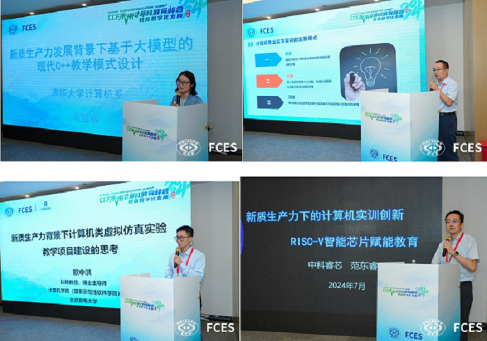 接着,清华大学马昱春教授分享了《新质生产力发展背景下基于大模型的现代C++教学模式设计》,为与会者提供了基于大模型的特色化C++课程教学新模式的宝贵经验。安高云教授则通过《探索计算机类双环协同实习实训教学新模式,服务新质生产力提升》,展示了公司在计算机实习实训教学新模式中的实践成果。北京邮电大学欧中洪教授以《新质生产力背景下计算机类虚拟仿真实验教学项目建设的思考》为题,分享了在新质生产力背景下对计算机类虚拟仿真实验教学项目建设的深入思考与见解。中科睿芯集团董事长范东睿分享了《新质生产力下的计算机实训创新RISC-V智能芯片赋能教育》,深刻探讨了在新质生产力快速发展的背景下,计算机实训创新RISC-V智能芯片赋能教育的重要性、现状、挑战及未来发展方向。