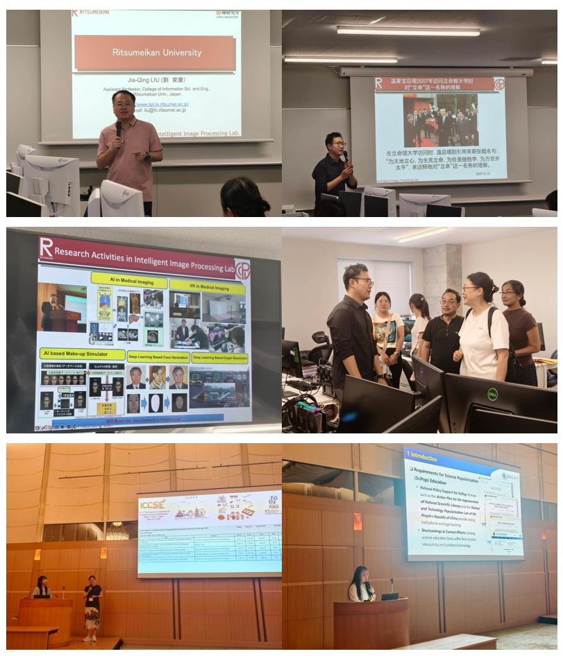 8月20日,团组教师前往立命馆大学(茨木校区)参加会前学术交流活动,立命馆大学刘家庆助教介绍其所在的信息科学与工程公司智能图像处理实验室情况,团组教师与刘家庆助教就研究内容和实验室建设进行深入交流。8月22日-8月23日,团组教师参加在福井国际交流会馆举办的第19届国际计算机科学与教育大会(ICCSE)主会议,听取大会主旨报告,与演讲和参会嘉宾就“计算机科学与教育”问题开展学术交流。彭文娟、赵守强等针对AI科普资源建设进行现场报告,周围作为分论坛主席组织活动。
