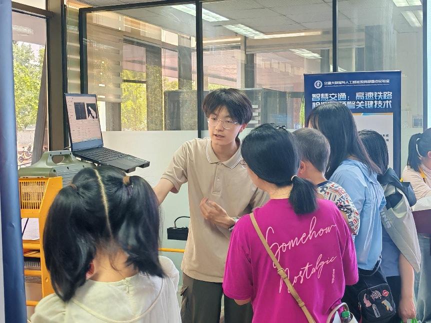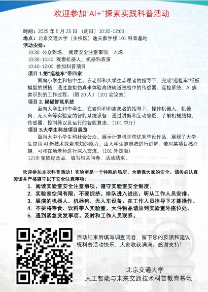 根据《科技部 中央宣传部 中国科协 关于举办2025年全国科技活动周和全国科技工作者日活动的通知》要求,为庆祝第九个全国科技工作者日,弘扬科学精神、普及科技知识,williamhill英国官网人工智能与未来交通技术科普教育基地举办系列科普活动。2025年5月25日,科普基地在逸夫教学楼101举办“AI+”探索实践活动。活动以“沉浸式体验科技魅力”为目标,通过揭秘智能系统(机器人互动、机器狗表演、无人车体验)、把“巡检车”带回家(AI+轨道运维、模型拼搭)、老员工科技项目展览等项目,为青少年打造了一场沉浸式AI科普盛宴,让社会公众近距离感受科技的魅力。